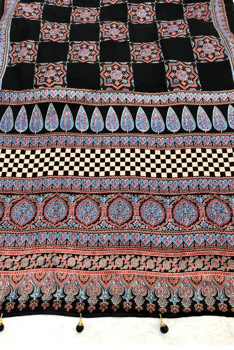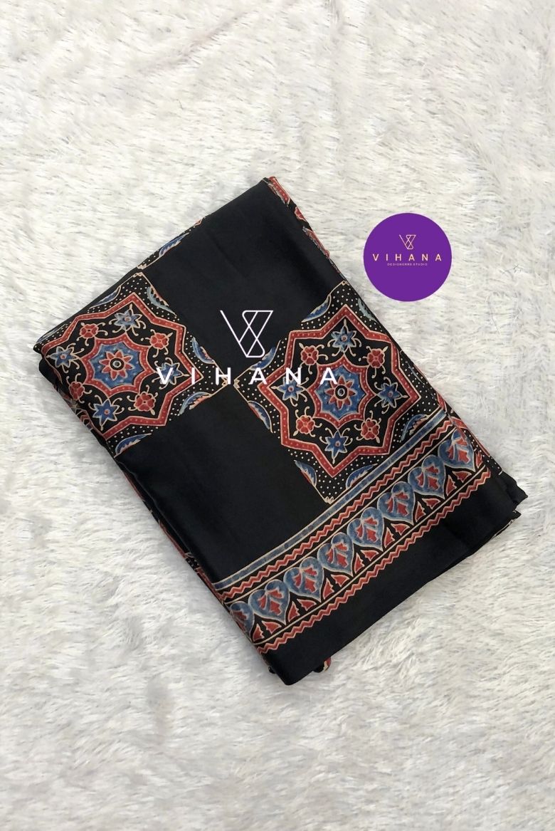The saree features traditional Ajrakh hand block printing, an intricate art form originating from Gujarat and Rajasthan. These designs often incorporate natural, eco-friendly vegetable dyes and classic geometric or floral patterns. The specific saree in the image displays a black base with vibrant, detailed geometric motifs in contrasting colors (red, blue, and hints of white/cream) along the border and as square embellishments on the main body of the fabric.