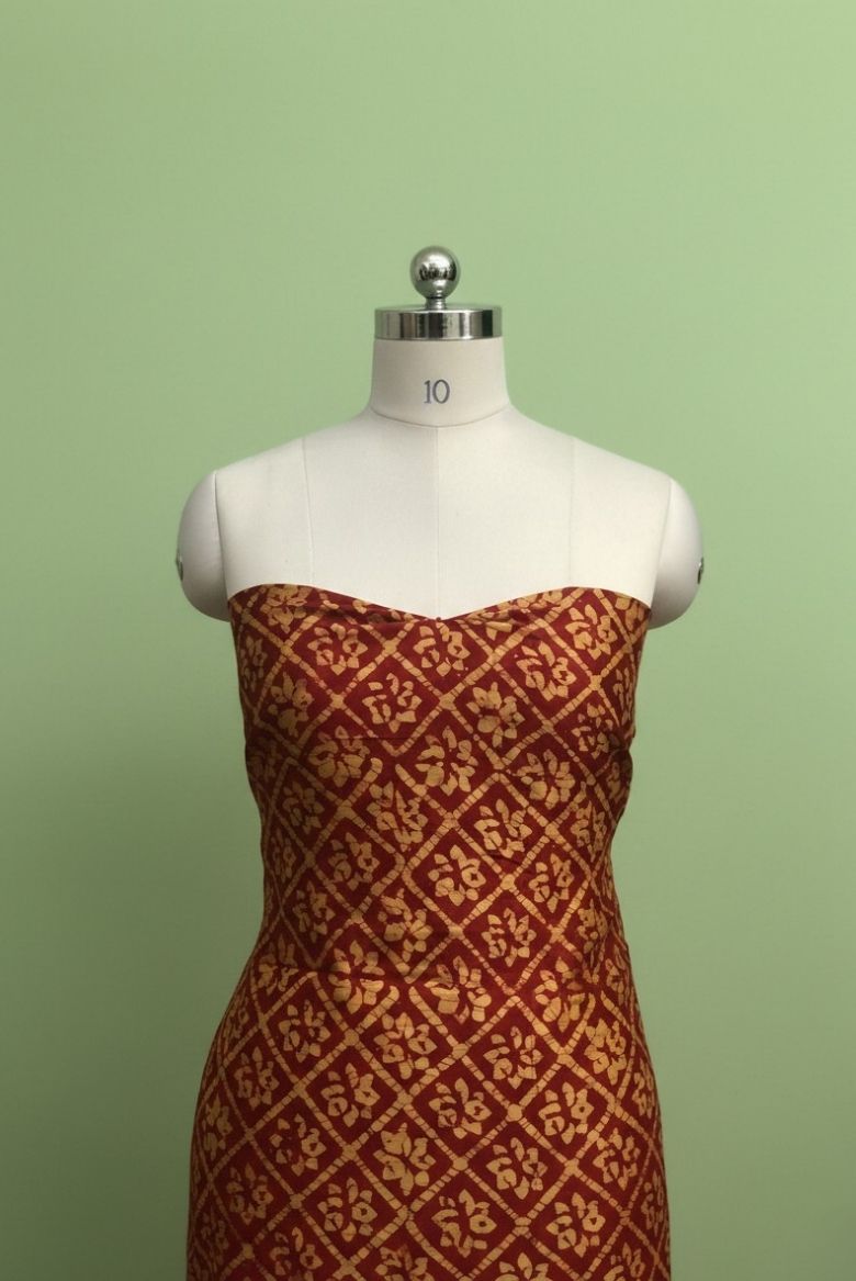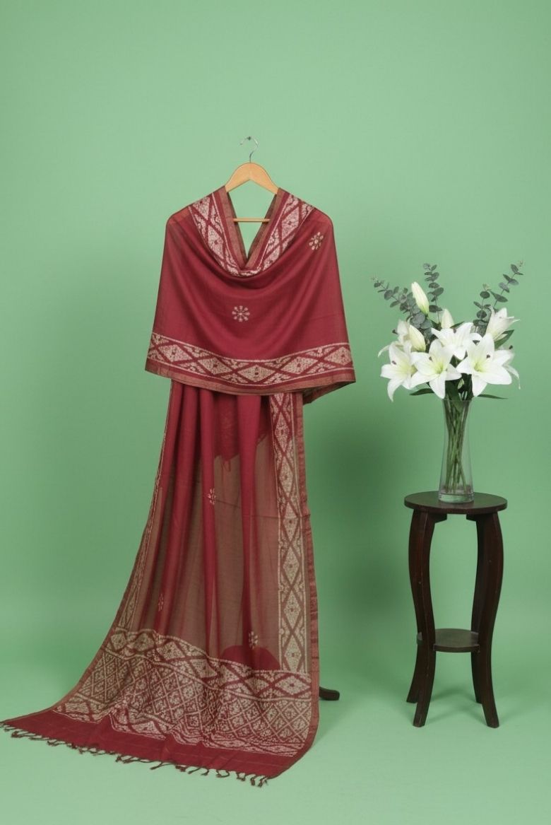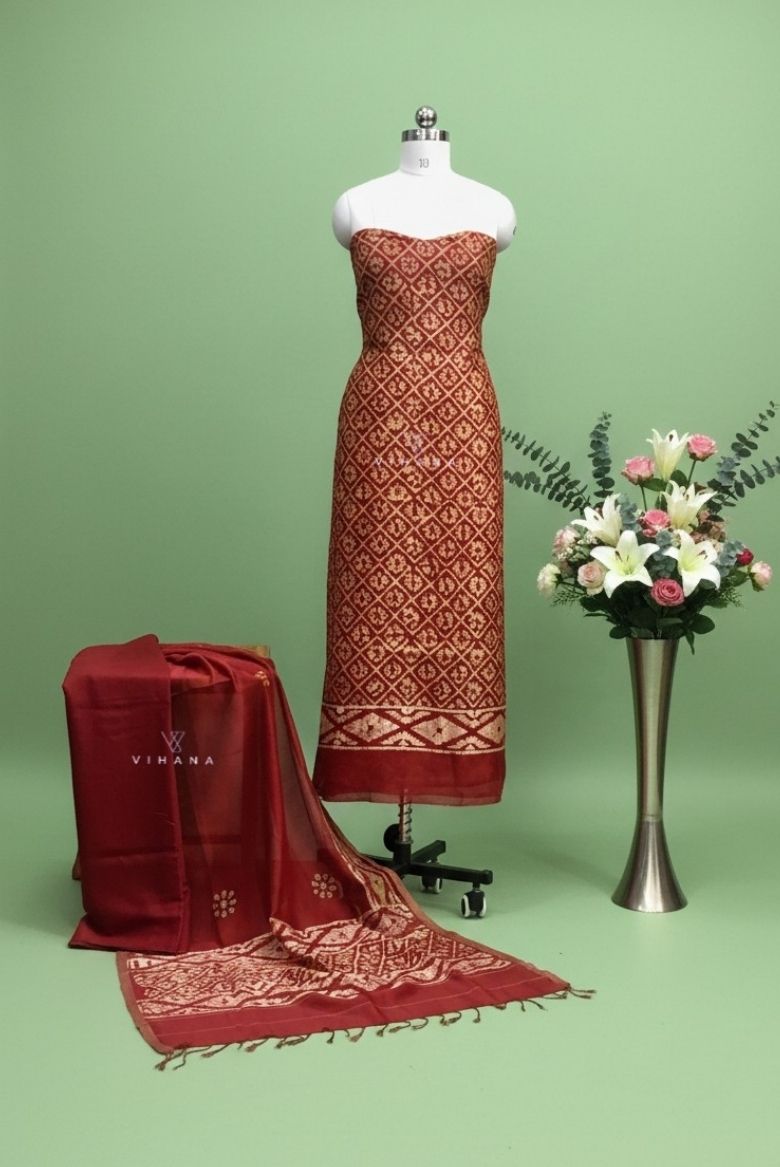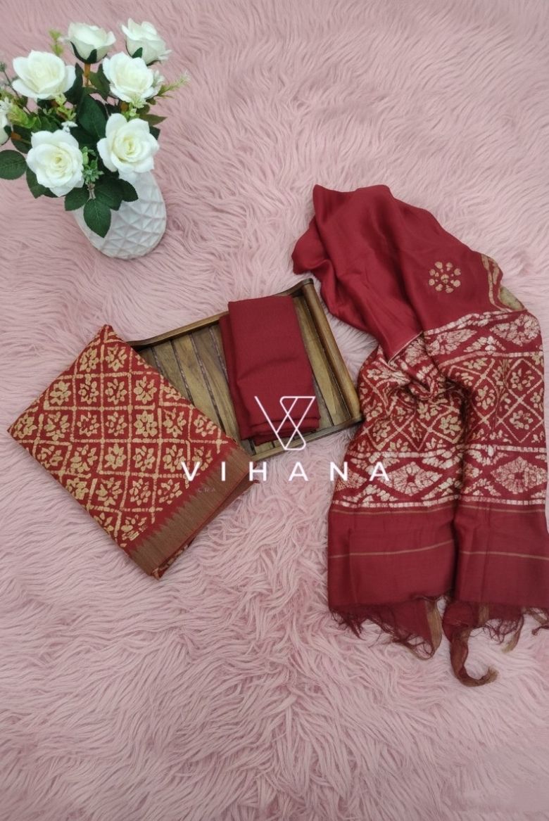 Premium Maheswari Silk Batik Print Salwar Suit – Dark Red with Gicha Border