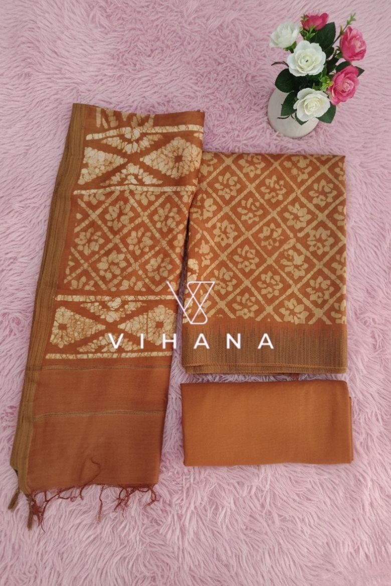 This exclusive Maheswari silk batik print salwar suit in a luxurious Mustard Yellow tone; which intricate batik artistry, beautifully enhanced with a handcrafted Gicha borders.