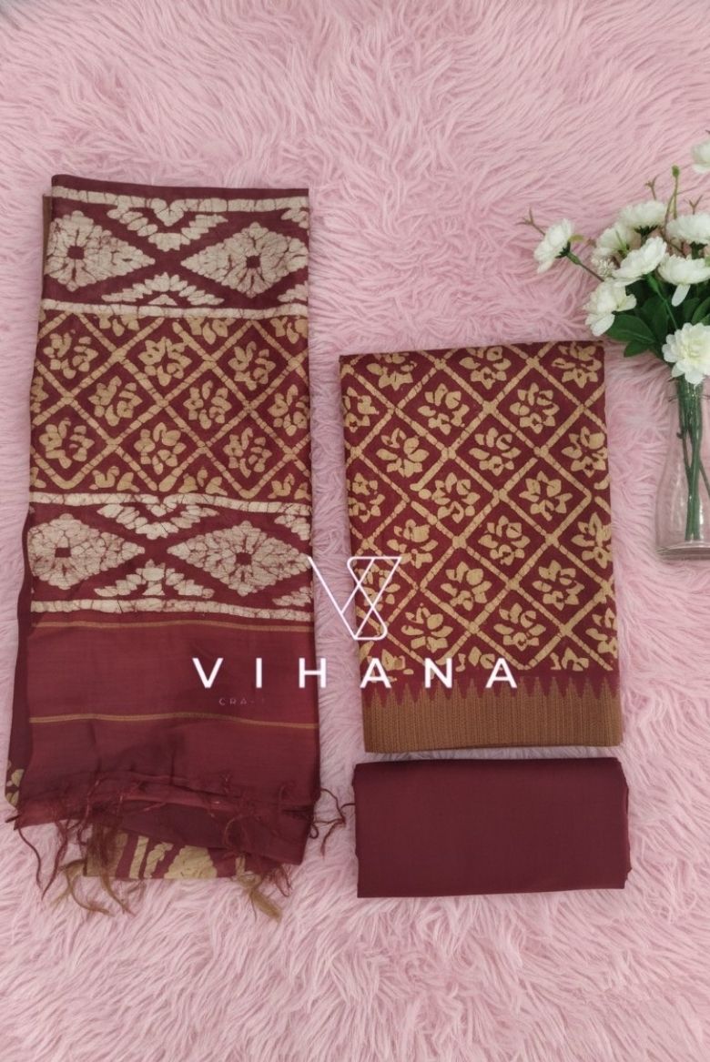 Premium Maheswari Silk Batik Print Salwar Suit – Rich Maroon with Gicha Border