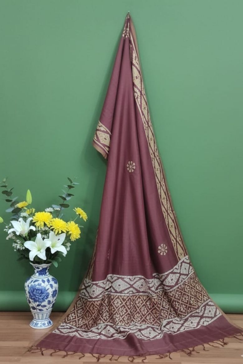 This exclusive Maheswari silk batik print salwar suit in a luxurious maroon tone; which intricate batik artistry, beautifully enhanced with a handcrafted Gicha borders.