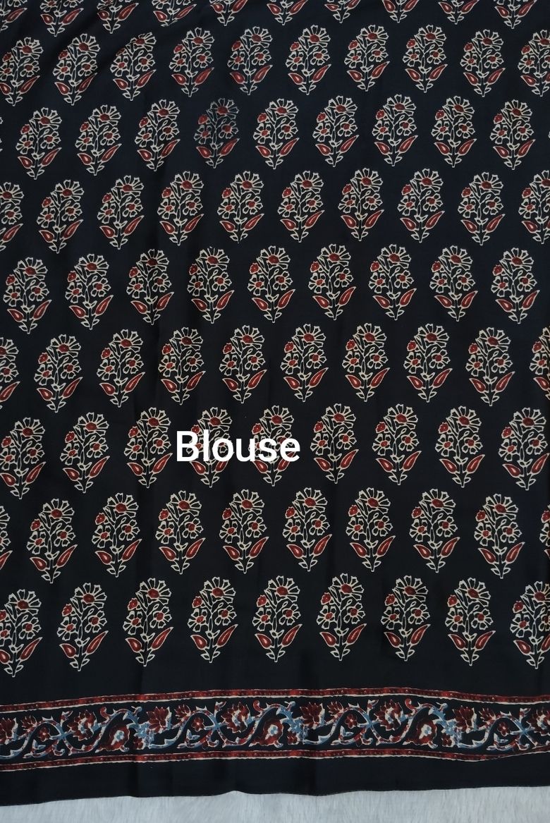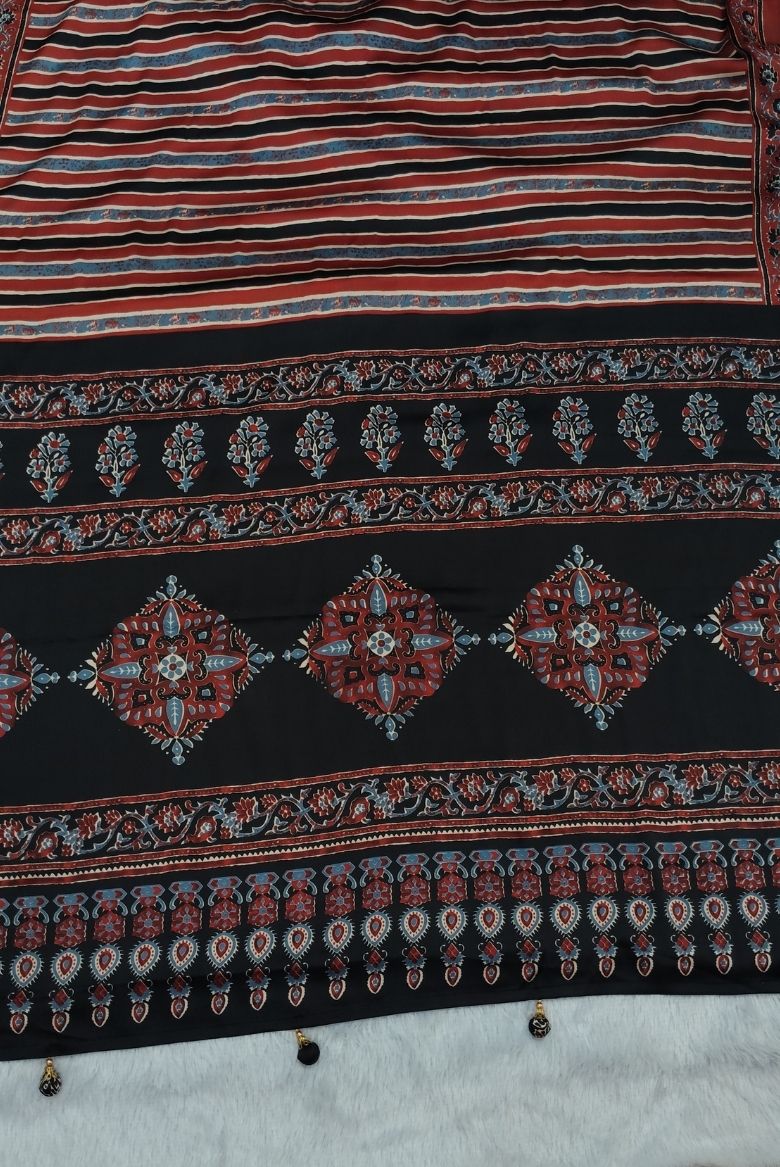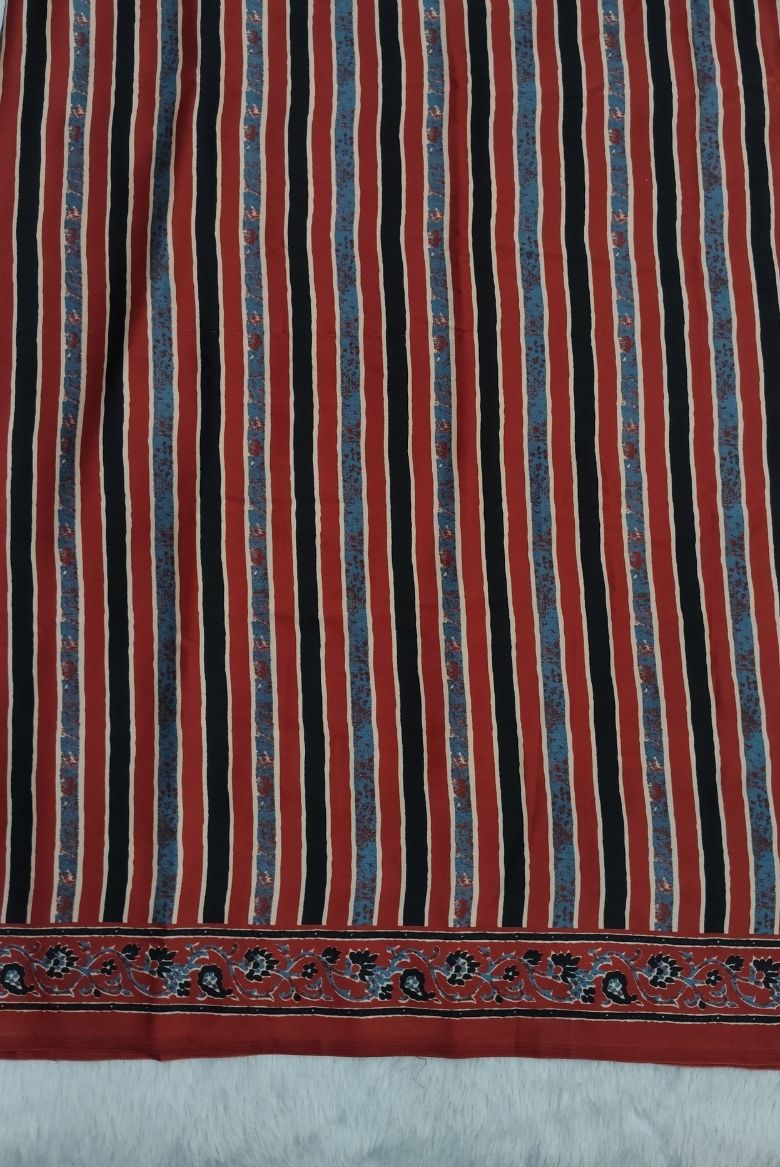 This saree features multi color stripes allover the body part with contrast ajrakh print along the borders. This saree have an elegant matching Pallu.