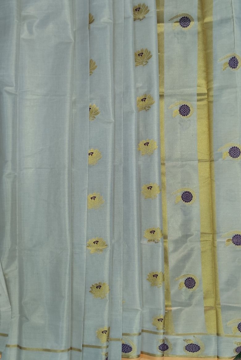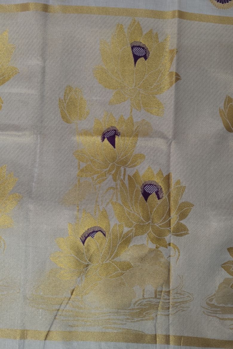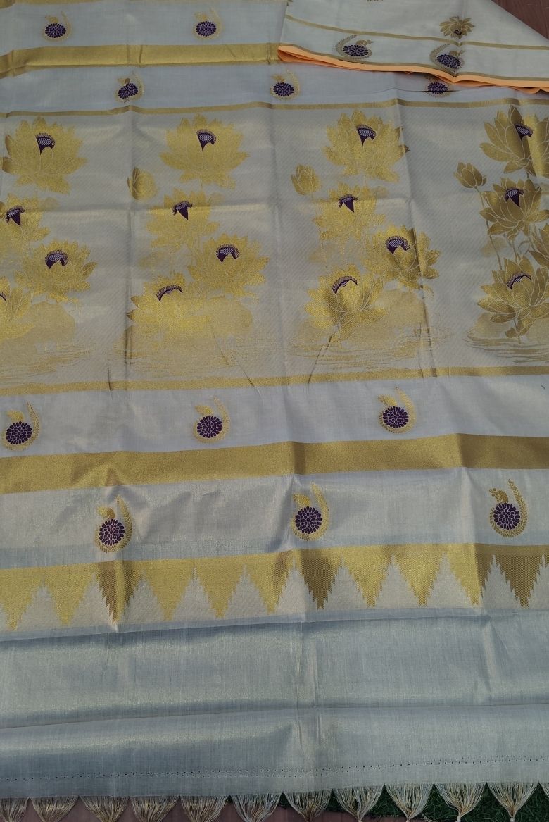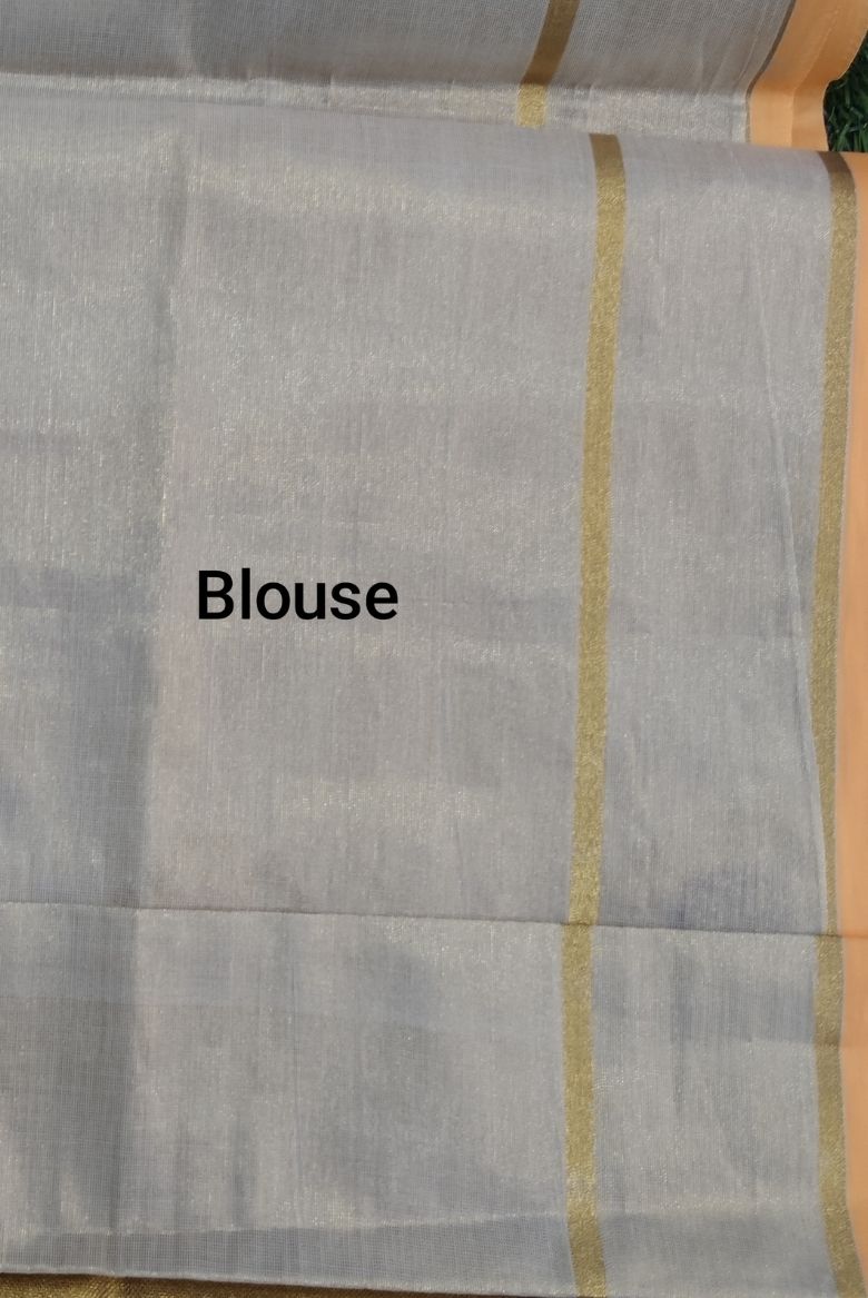 This beautiful tissue set saree features a soothing pastel base with a soft natural sheen, creating a graceful and refined look. The body is adorned with delicate lotus motifs woven in rich gold zari, symbolizing purity and timeless elegance. Highlighting the saree is its striking peacock-inspired border, detailed with contrast circular motifs and fine zari lines that add a regal touch.