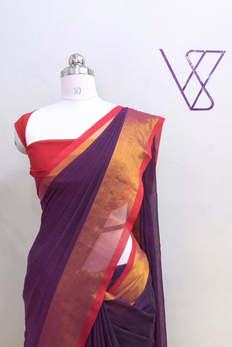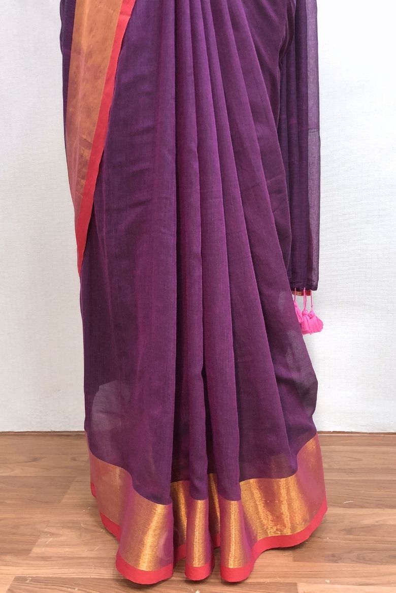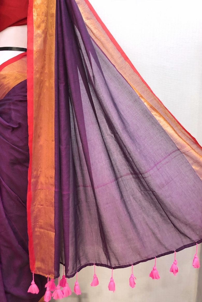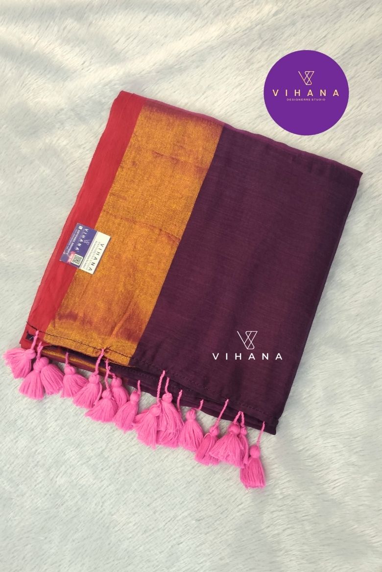 This saree features a plain body with a distinct gold or zari border. Often includes a contrasting red border along the saree. The pallu frequently features elegant pink tassels for added detail.