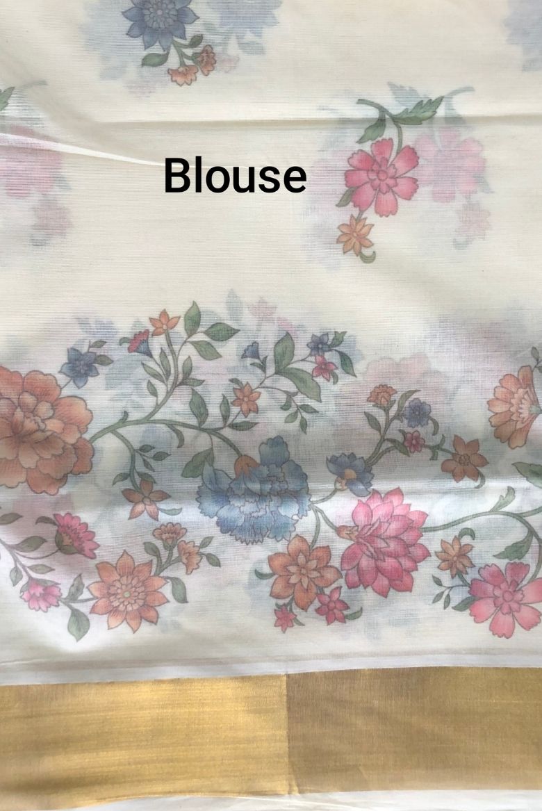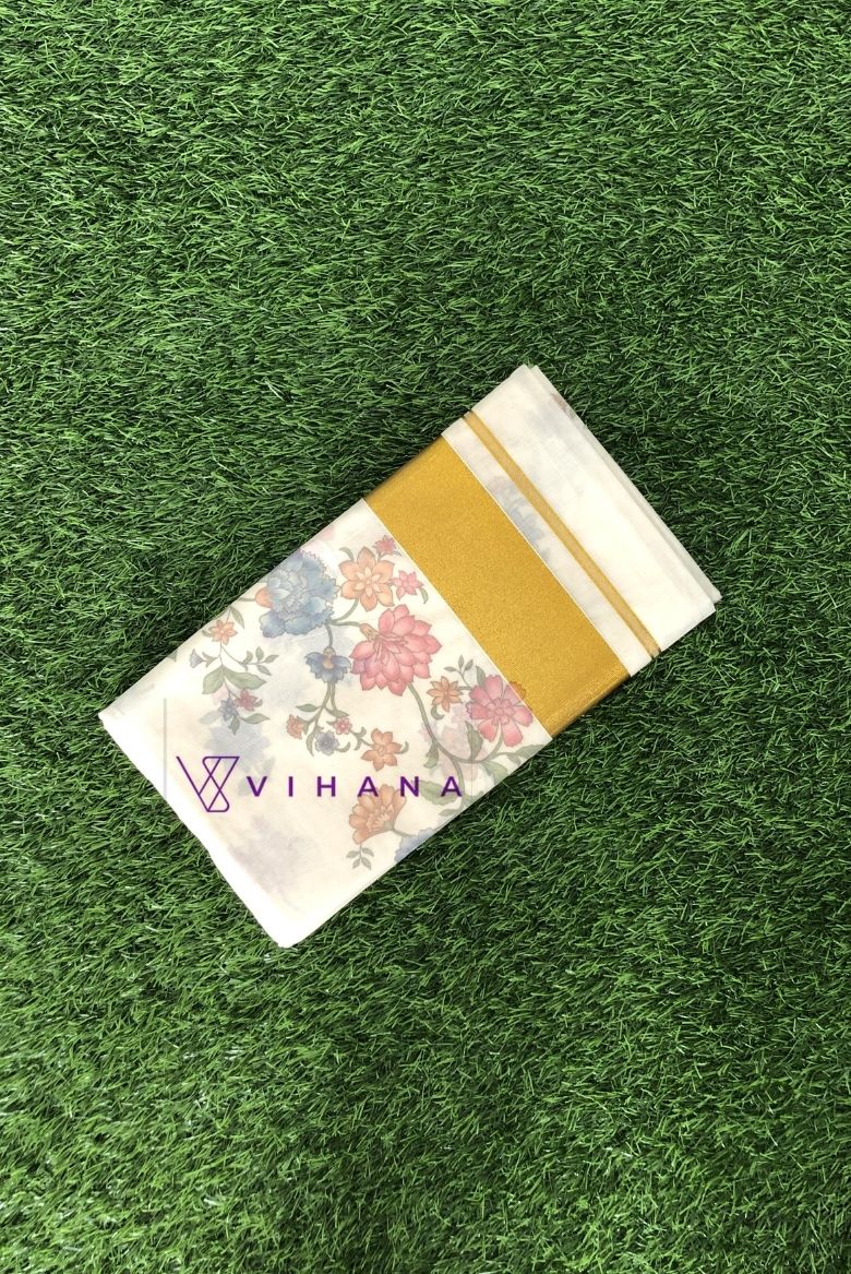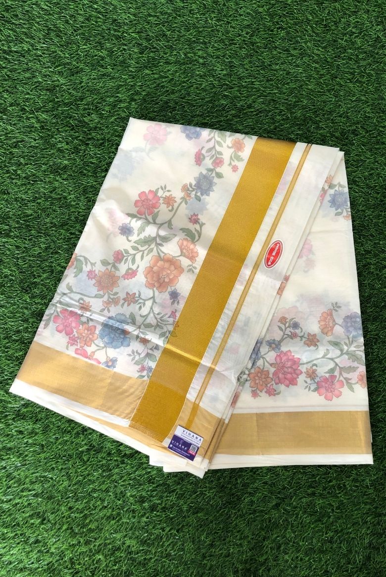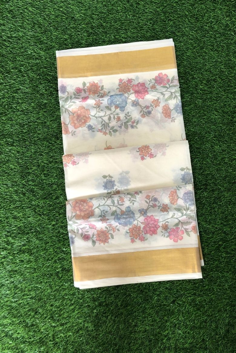 Pure Cotton Set Saree with Digital Floral Prints and Golden Border.