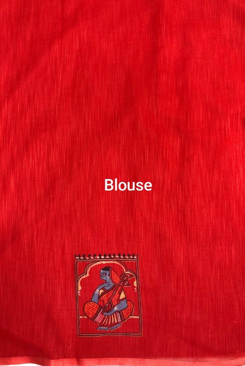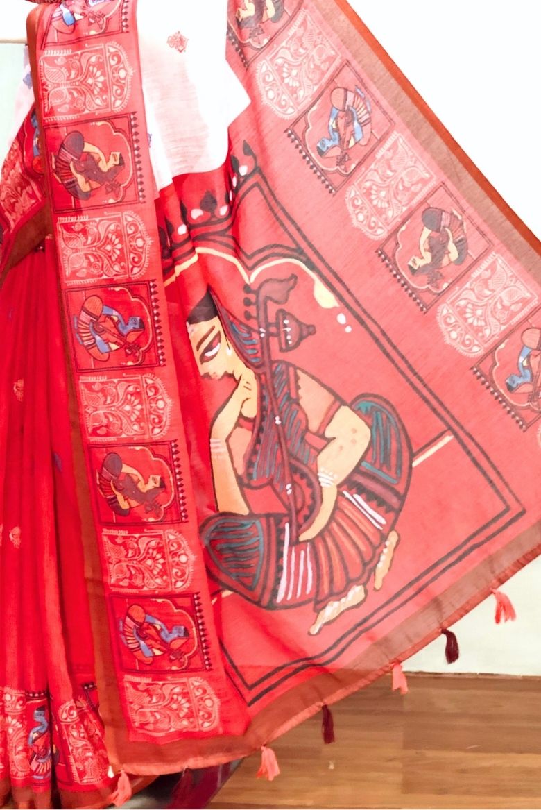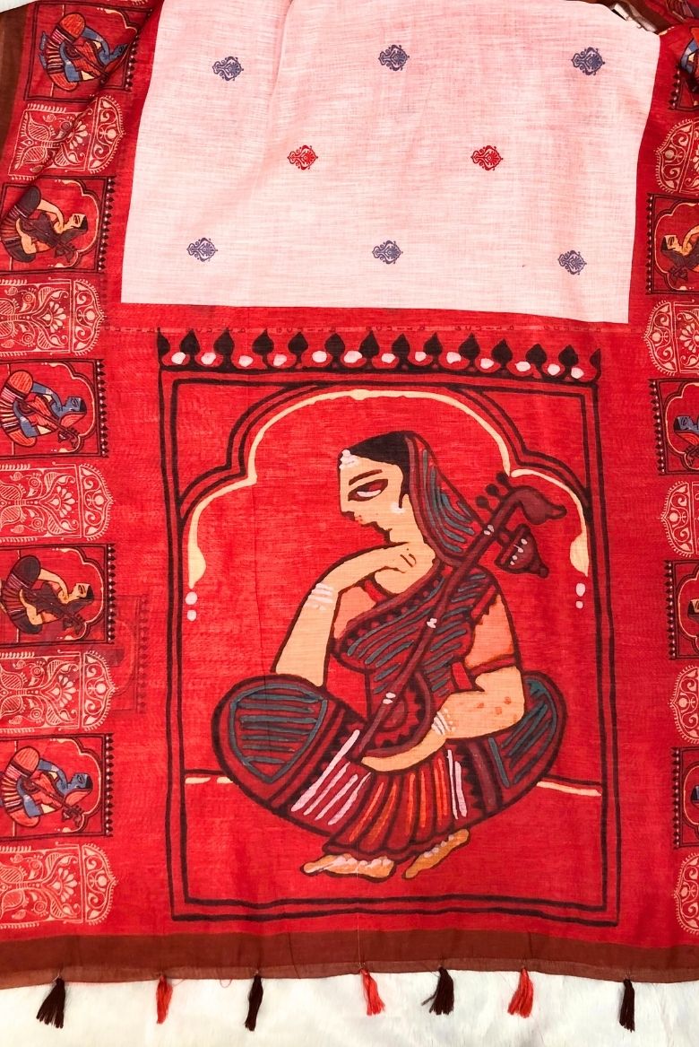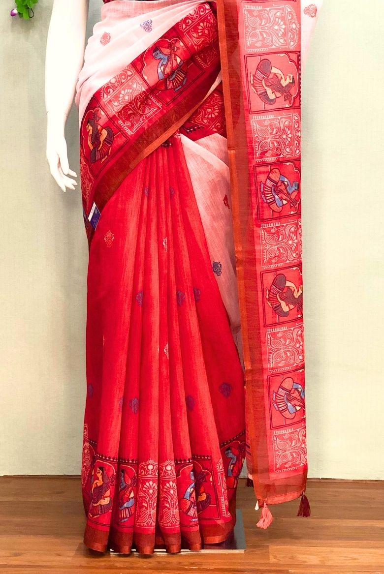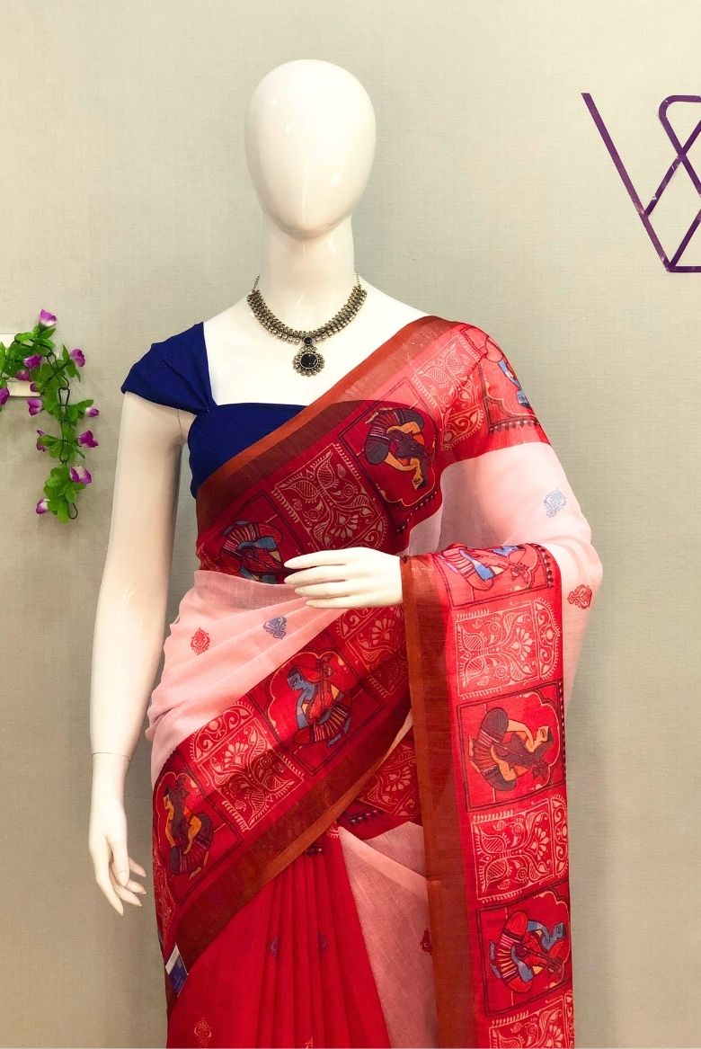 Red and Light Pink Hue Linen Cotton Saree with Traditional Prints