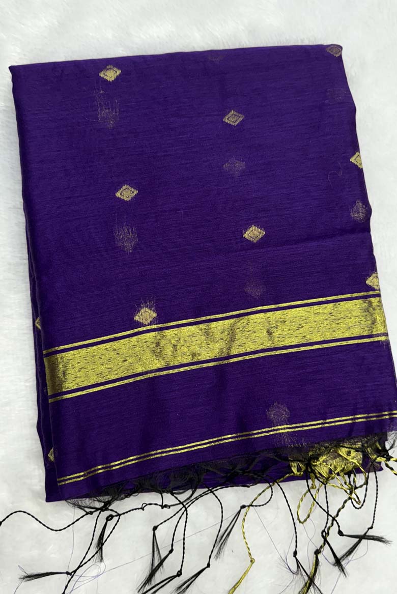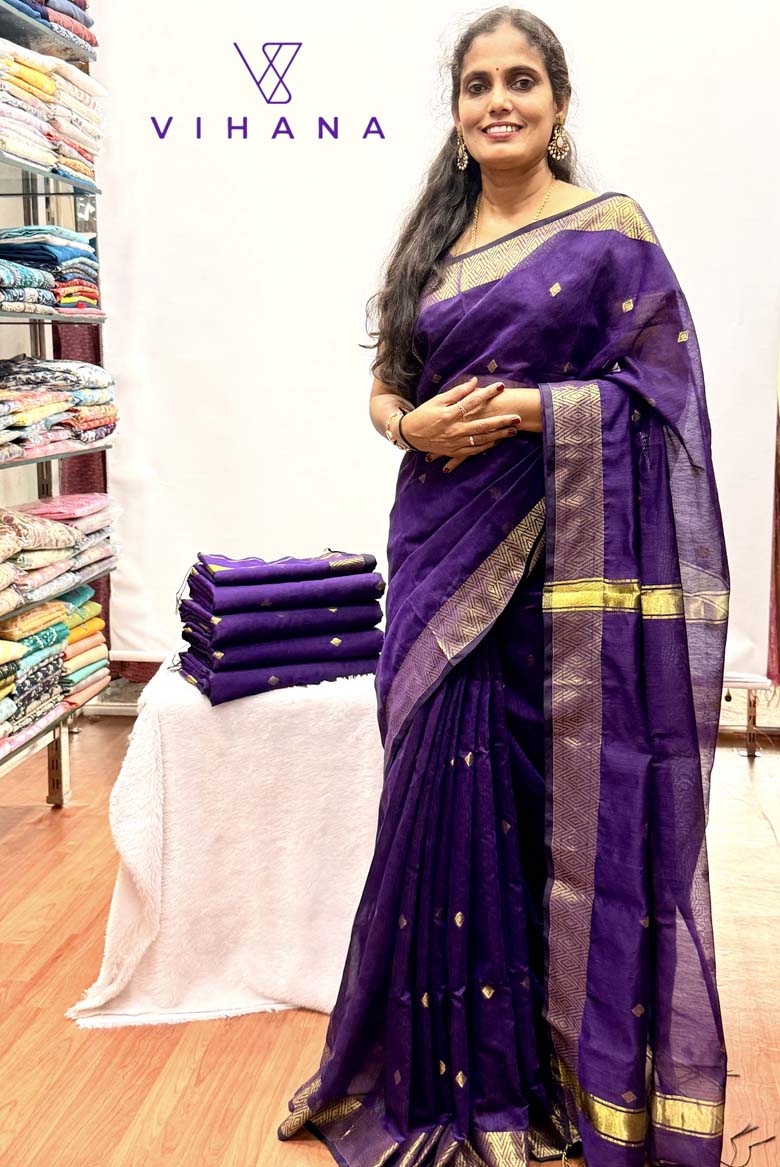 Elevate your ethnic style with this stunning Rich Violet Maheshwari Silk Cotton Saree, inspired by the timeless elegance of actress Nayanthara. Crafted from premium silk cotton, it features a beautifully woven golden zari border and a monochrome body that exudes minimalist charm. Lightweight and breathable, it’s perfect for festive occasions, weddings, and traditional gatherings. Comes with a matching unstitched blouse piece for custom styling. A graceful blend of comfort, tradition, and elegance — a must-have for every ethnic wardrobe.