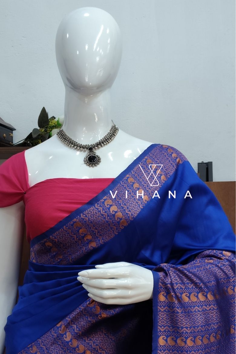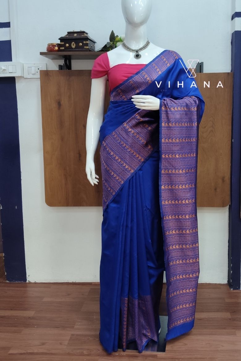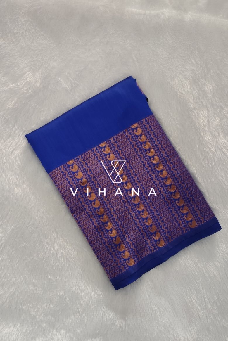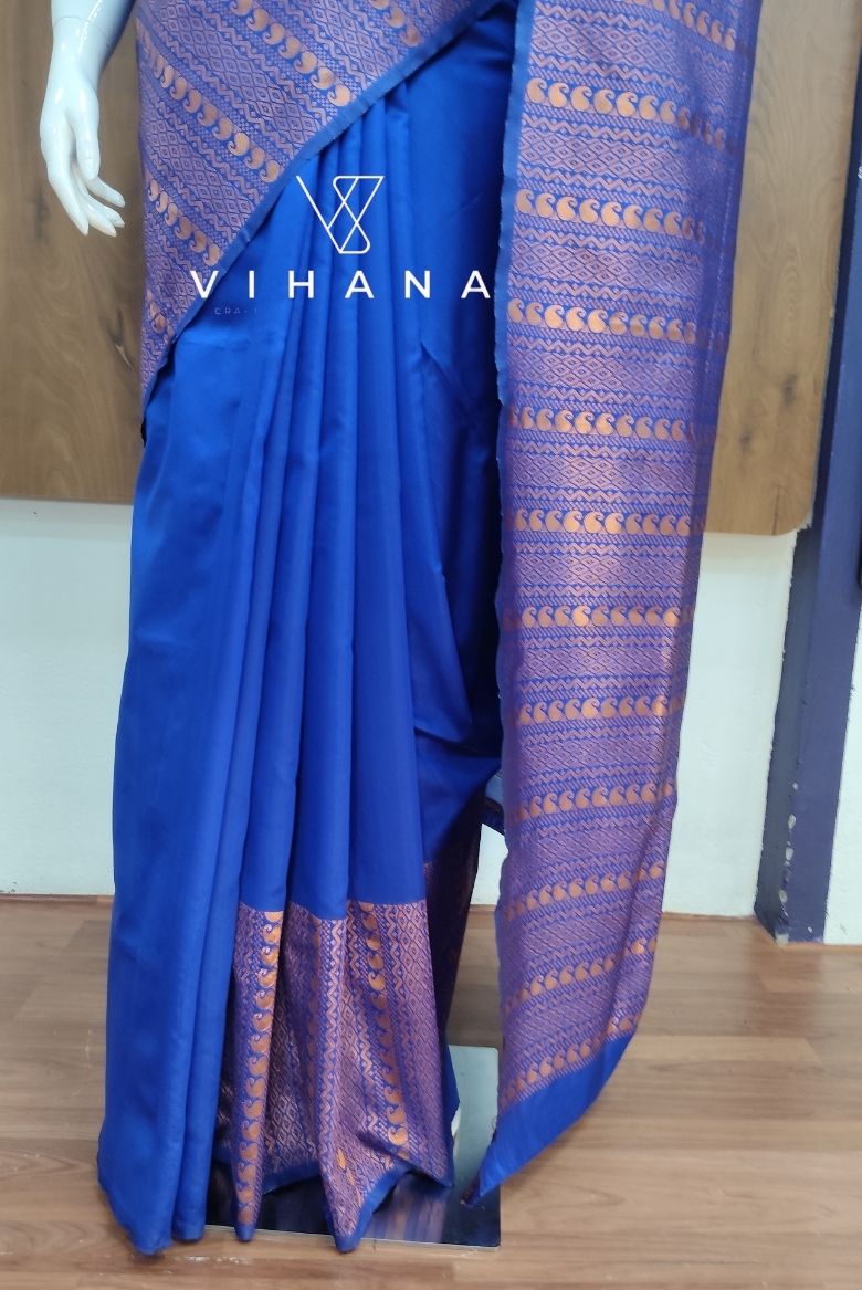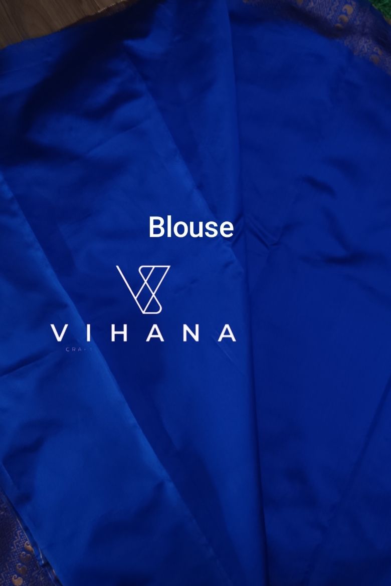 The Sree features a wide royal blue border woven with intricate golden motifs ,adding a classic , traditional touch . The Pallu continues this royal blue and gold pattern heavily ,making it the highlight of the saree.