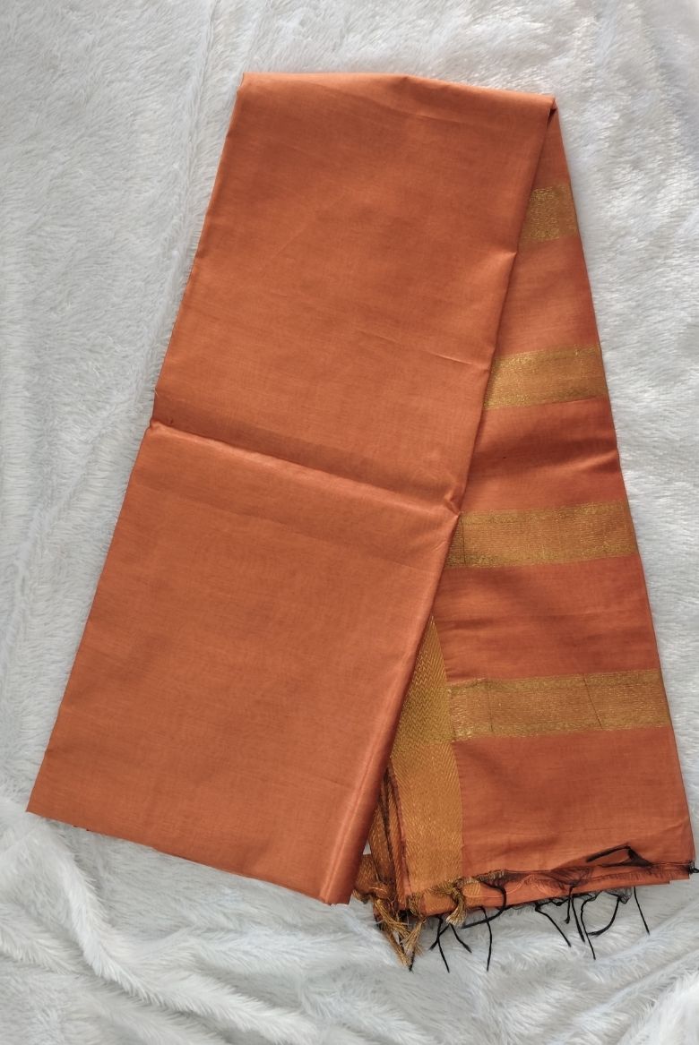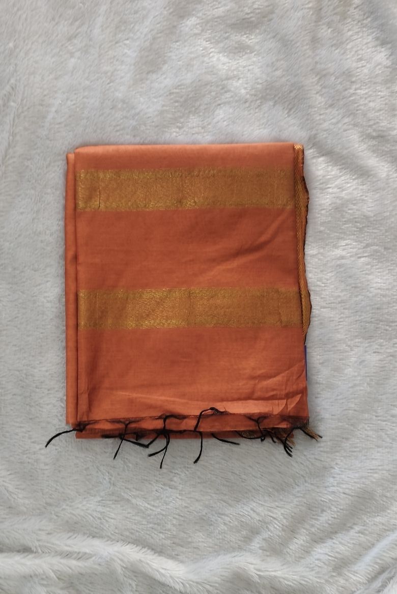 This saree features a Rust Orange body with a prominent wide golden zari border . The Pallu is highlighted with that same Golden zari stripe designs.