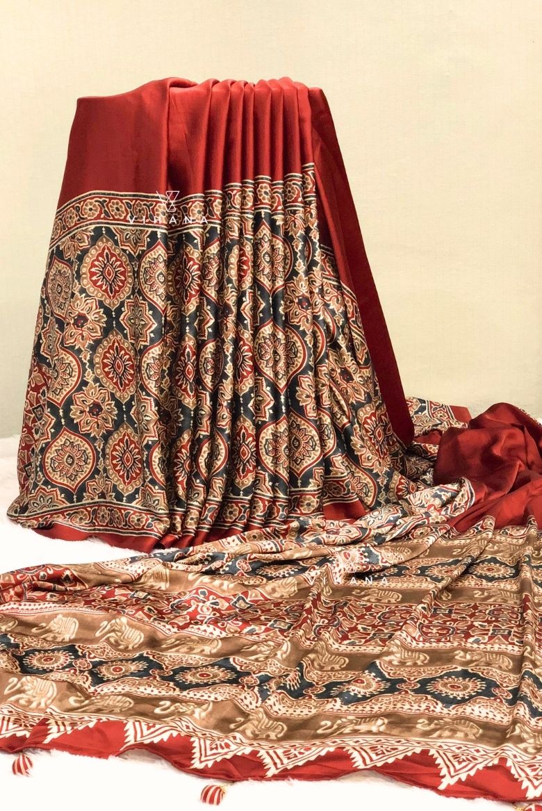 Rust Orange Modal Satin Silk Saree with Traditional Ajrakh Print