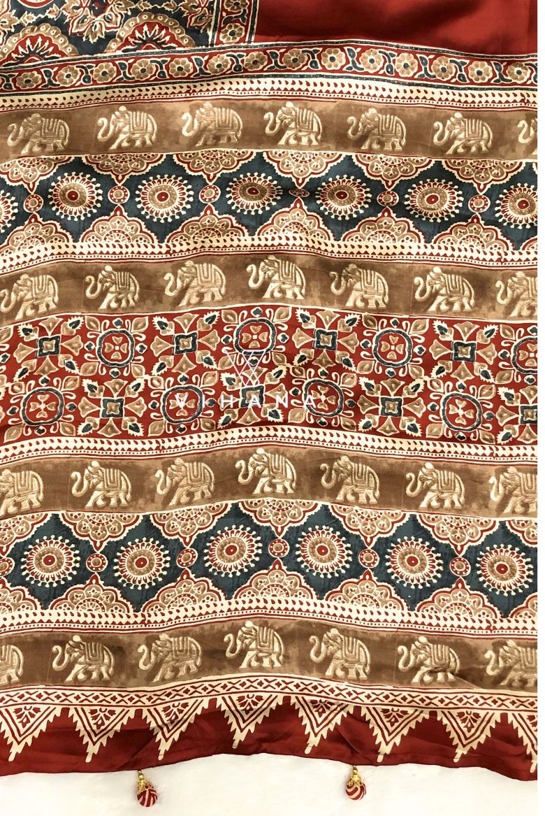 Featuring Ajrakh-inspired block prints and a beautifully detailed pallu with traditional elephant and floral motifs, this saree is designed for women who adore heritage with a modern twist.