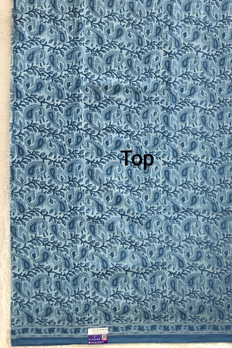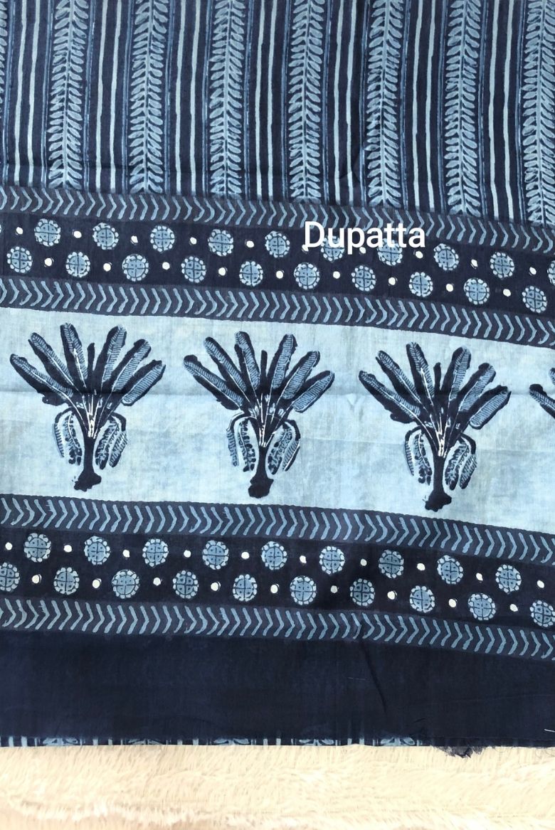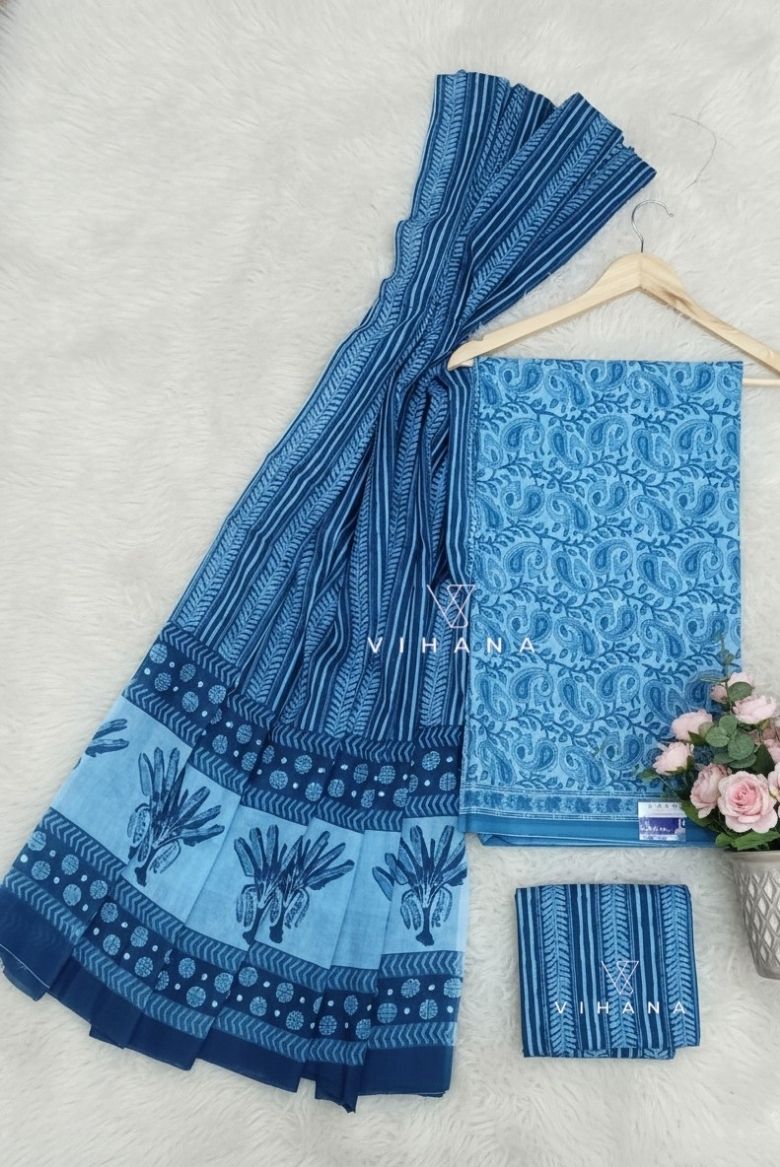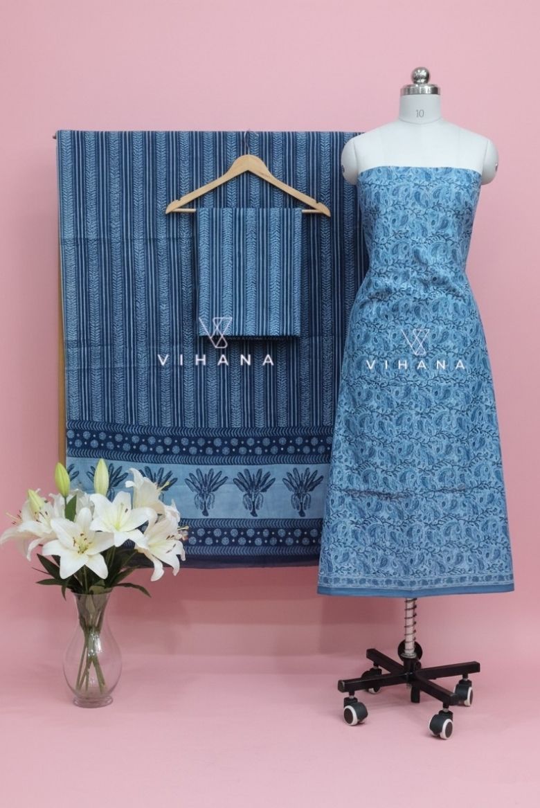 This soft cotton salwar suit material features a delicate blue floral block-inspired print that reflects calm sophistication and timeless charm.