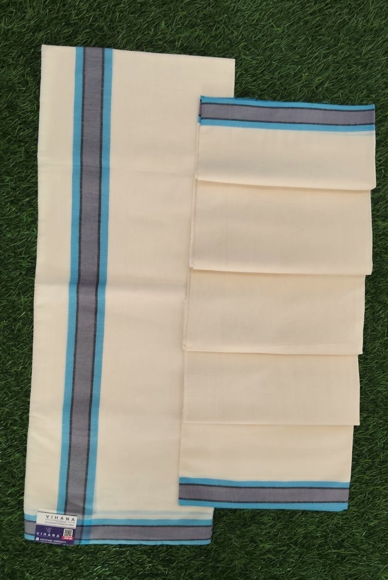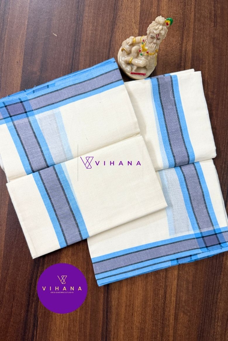 This Set mundu features a plain off-white with a striped border (known as kattikara or chuttikara design) in shades of blue and grey.