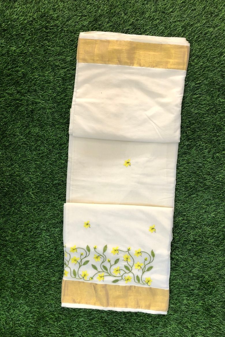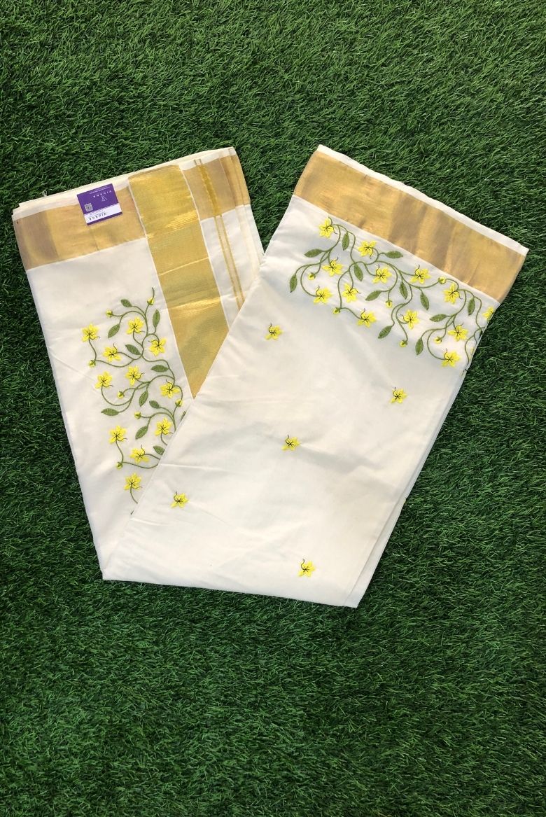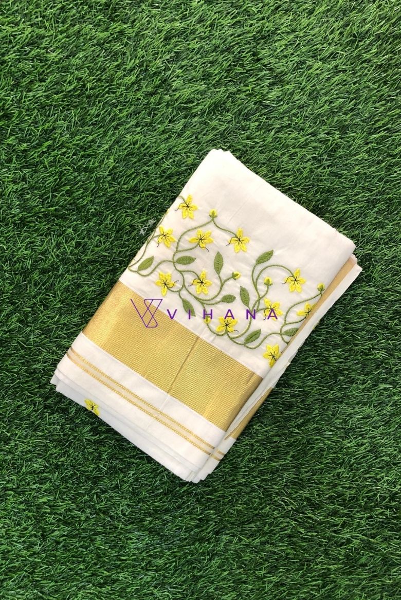 Traditional Kerala Cotton Set Saree- Kanikonna Floral Embroidery