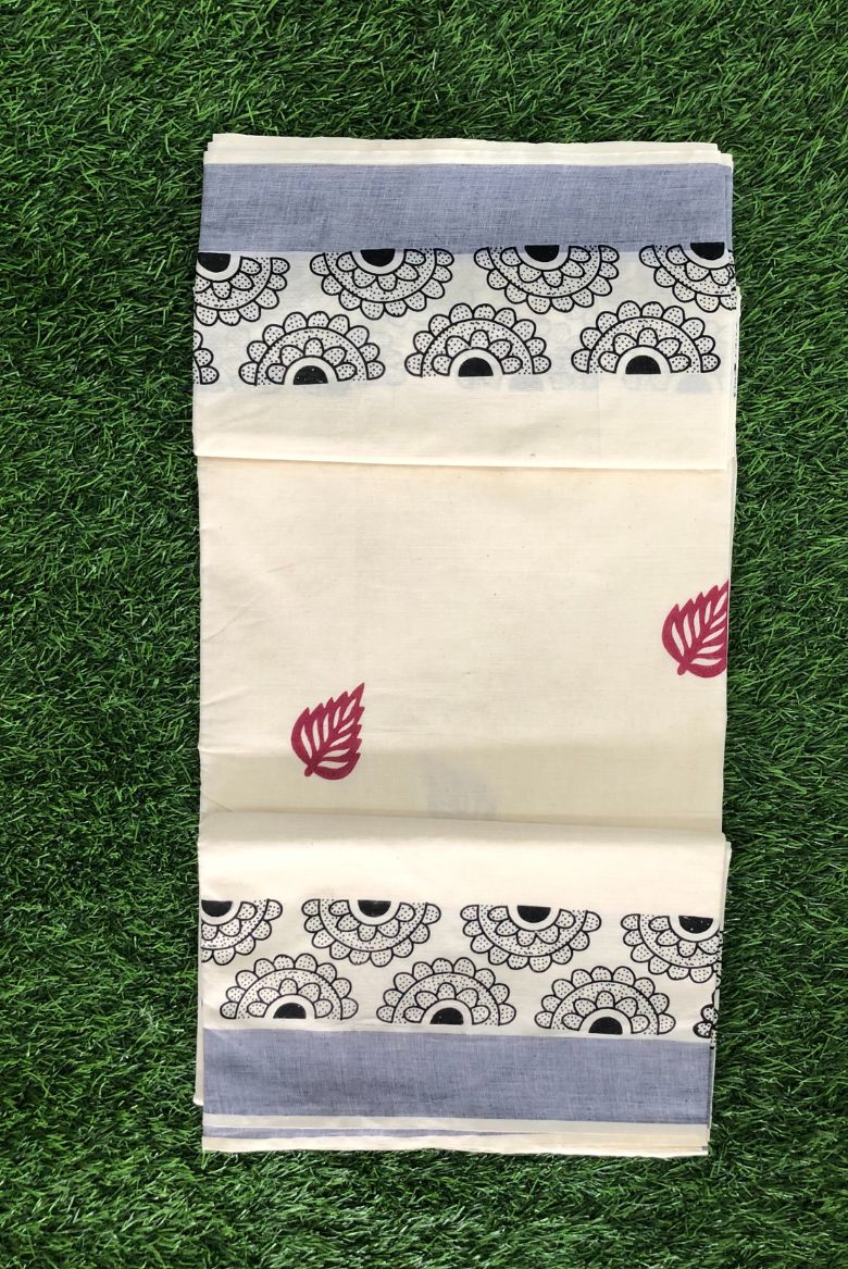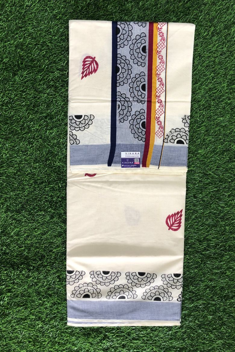 Traditional Kerala Cotton Set Saree with Mandala Patterns and Vibrant Leaf Motifs