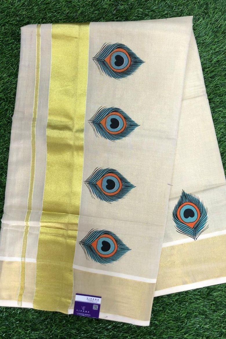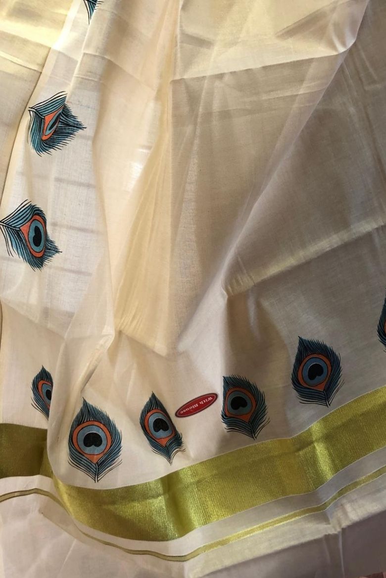 This Tissue Set saree features peacock feather motifs prints allover the body and also on the pallu too beautifully. A traditional Golden Kasavu border runs along the length of the saree, adding a touch of elegance and heritage charm.