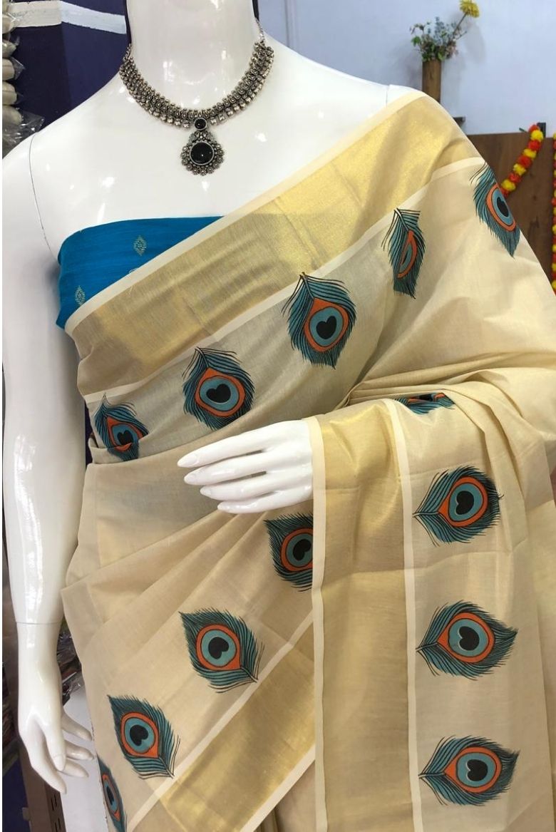 Traditional Kerala Golden Tissue SetSaree with Peacock Feather Prints