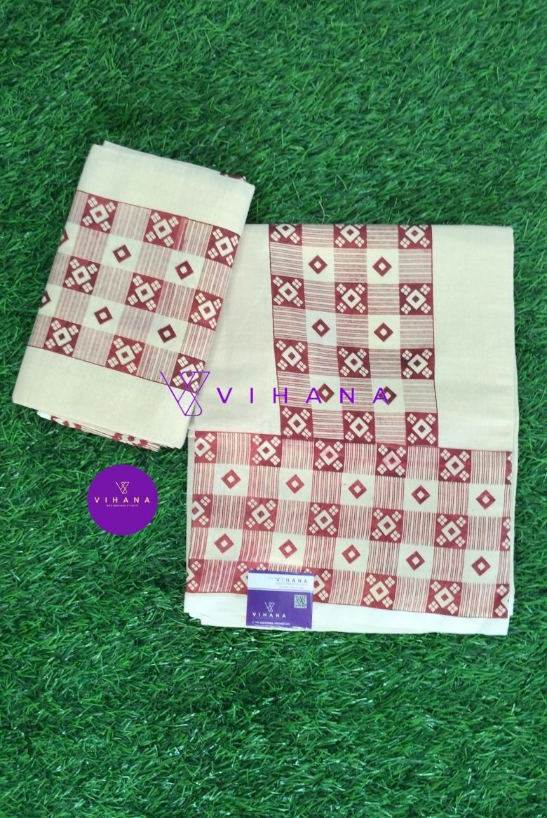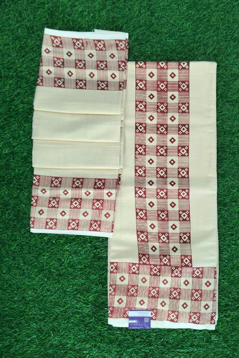 This set mundu is adorned with woven or printed geometric motifs in shades of maroon and brown. The pattern includes squares and diamond shapes arranged in a repeating, checkered style.