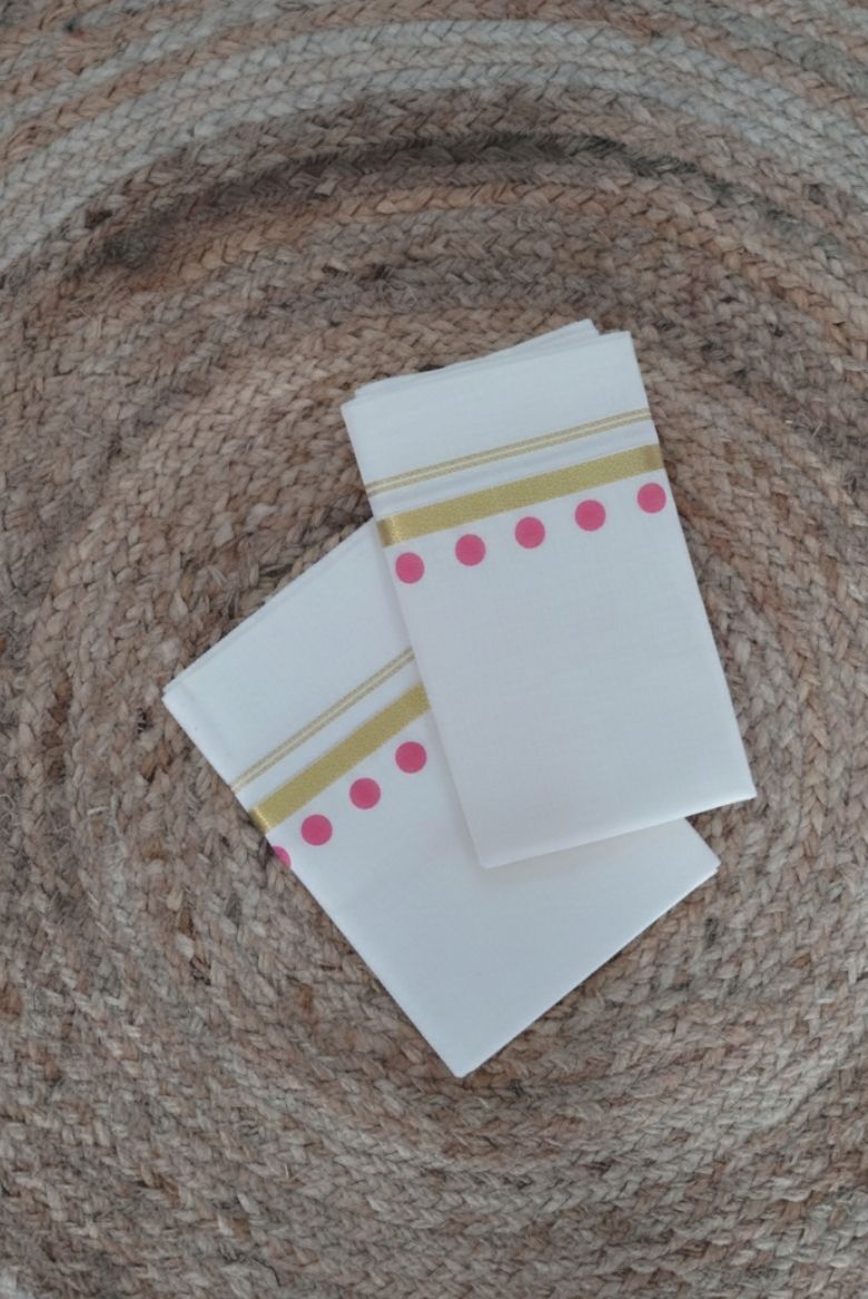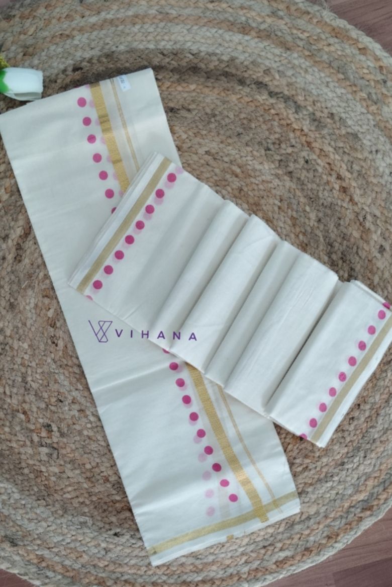 This set mundu features a pattern of pink polka dots and a traditional golden kasavu border.