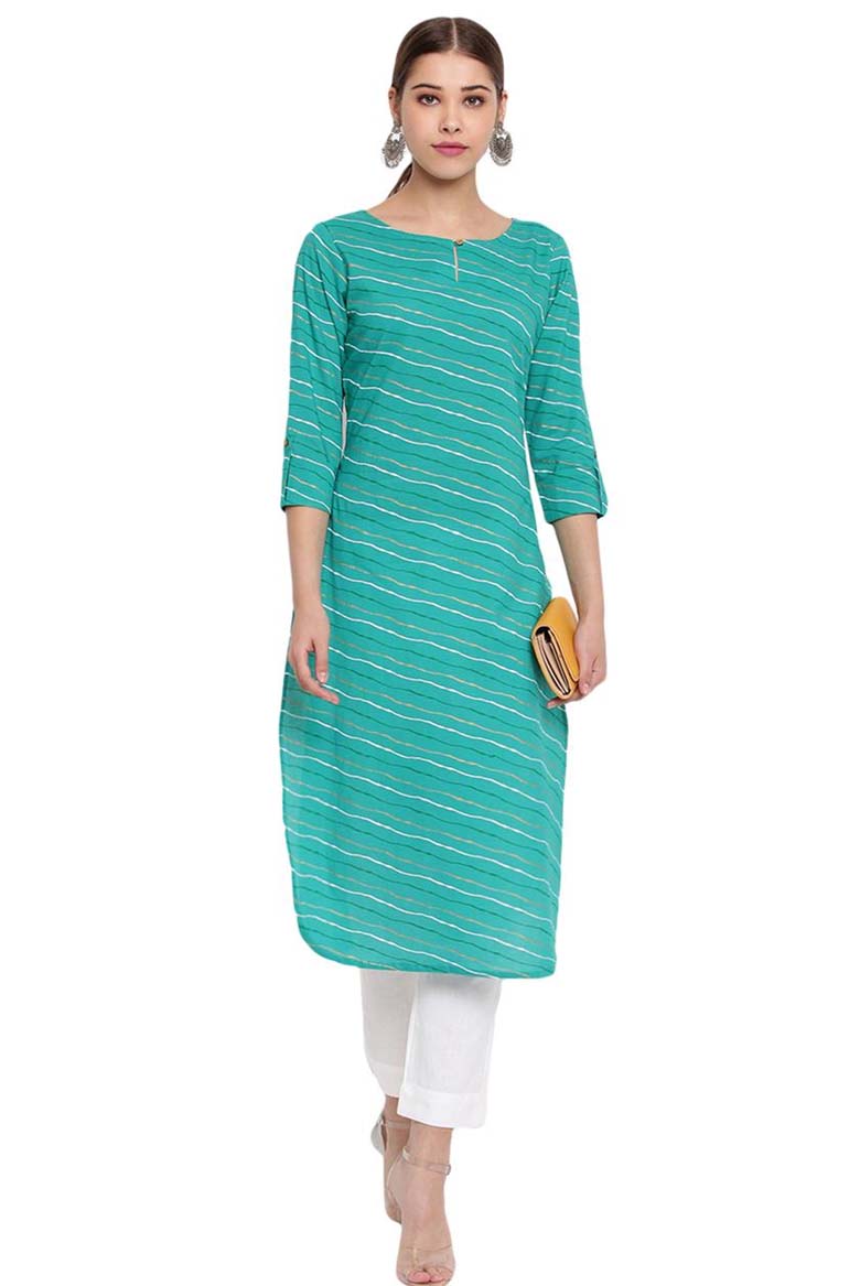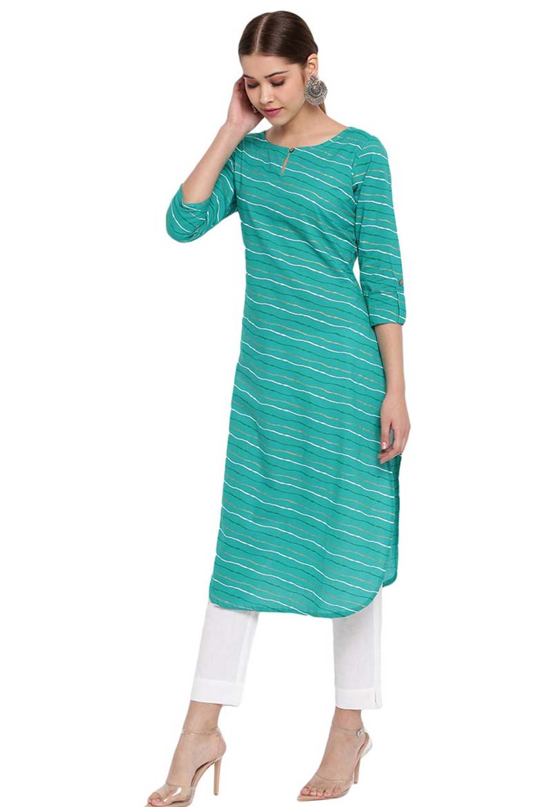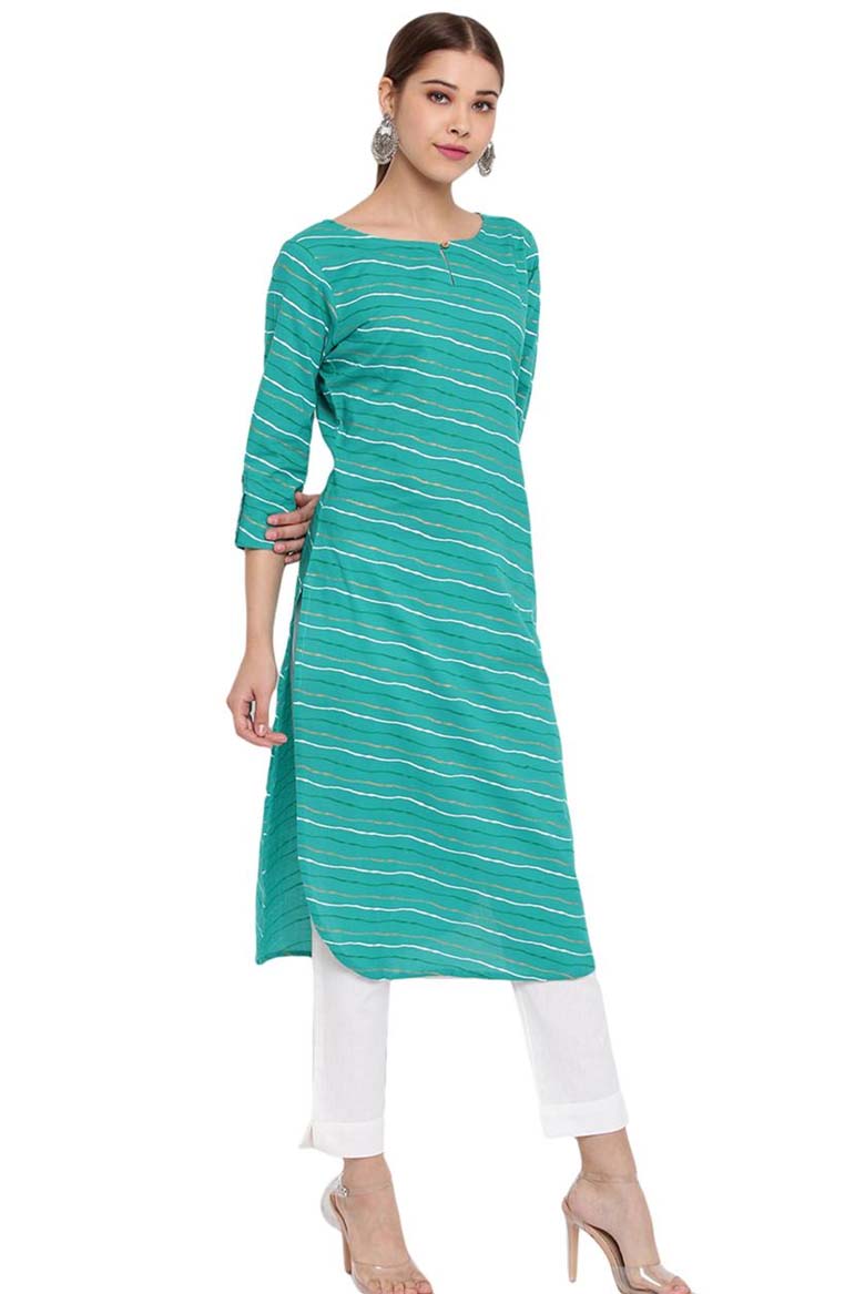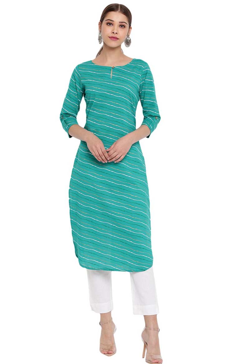 Look and feel beautiful in this uniquely designed kurta from janasya. This cotton kurta has keyhole neckline with wooden button detail, three quarter roll-up sleeves with buttons, straight style with curved hemline and overall leheriya style printed stripes highlighted by gold toned foil print. Sport this green piece with studded flats and minimal jewellery for a simple yet stunning ensemble.